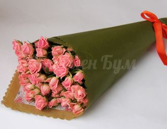 Состав: роза кустовая-9, крафт-бумага-2, атласная лента-1, услуги флориста.