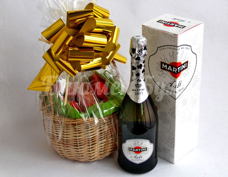 Состав: клубника 1 кг, корзинка малая, шампанское "Абрау Дюрсо" 0,75 л. полусладкое, оформление слюдой и бантом.